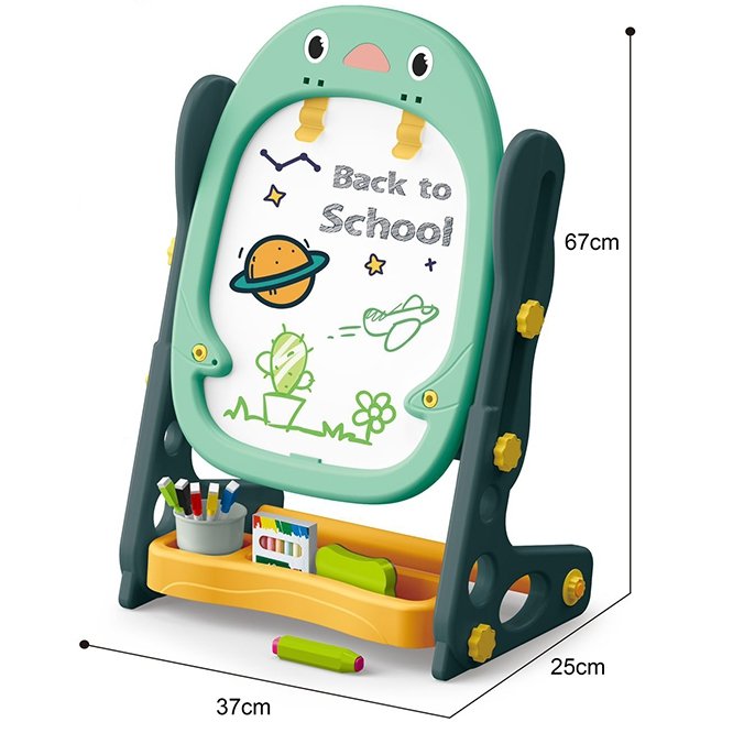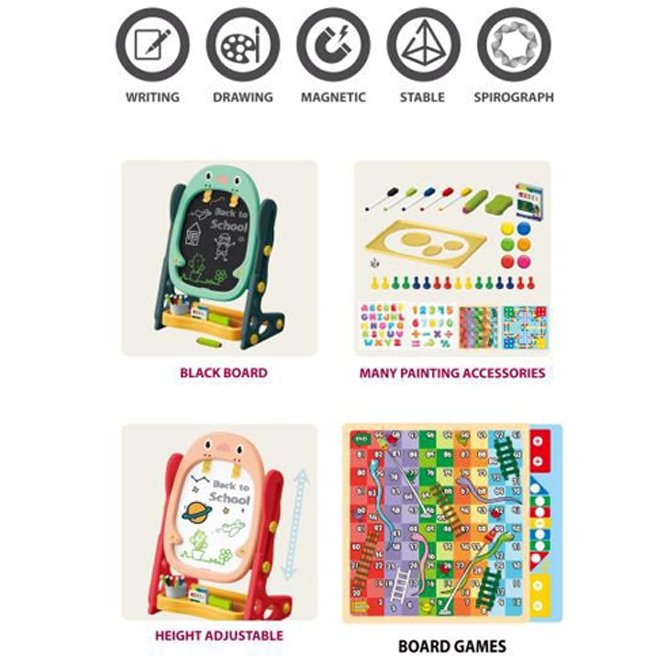 56 vnt piedų: magnetinės raidės, skaičiai, kempinėėlė, 2 stalo žaidimai, žymekliai, kreidelės ir kt.