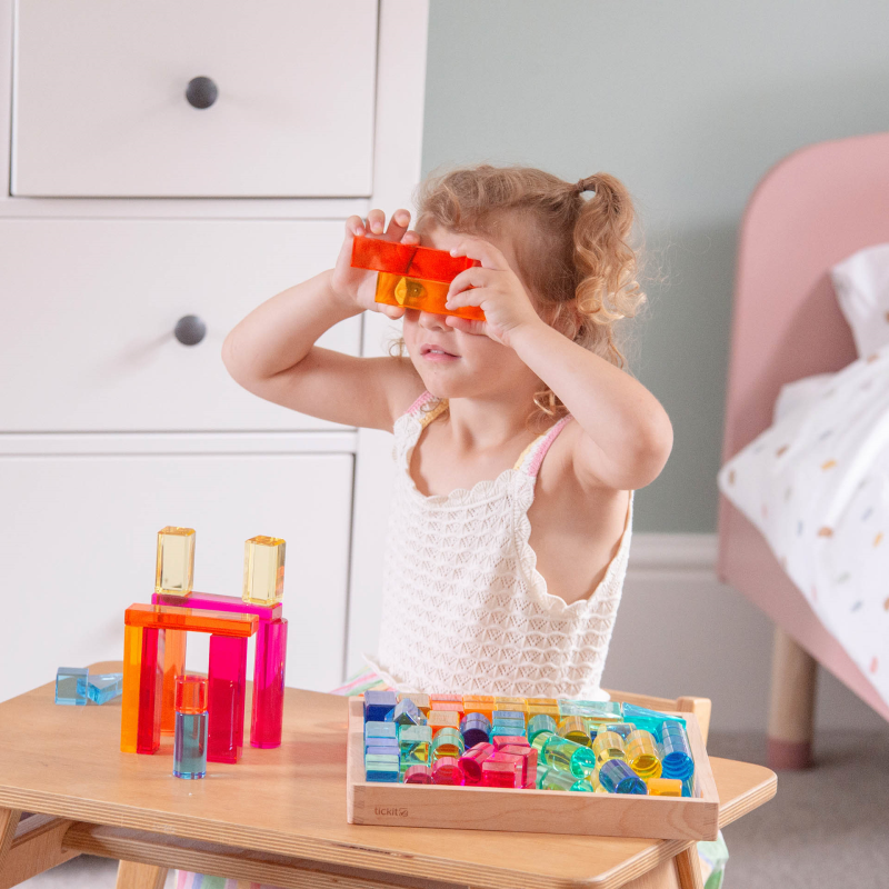 Rinkinį sudaro 20 kubelių, 20 apskritimų, 8 stulpeliai, 8 stačiakampiai, 8 lentos, 8 trikampiai ir FSC sertifikuotas buko medienos padėklas su veidrodiniu akrilo ir faneros pagrindu.