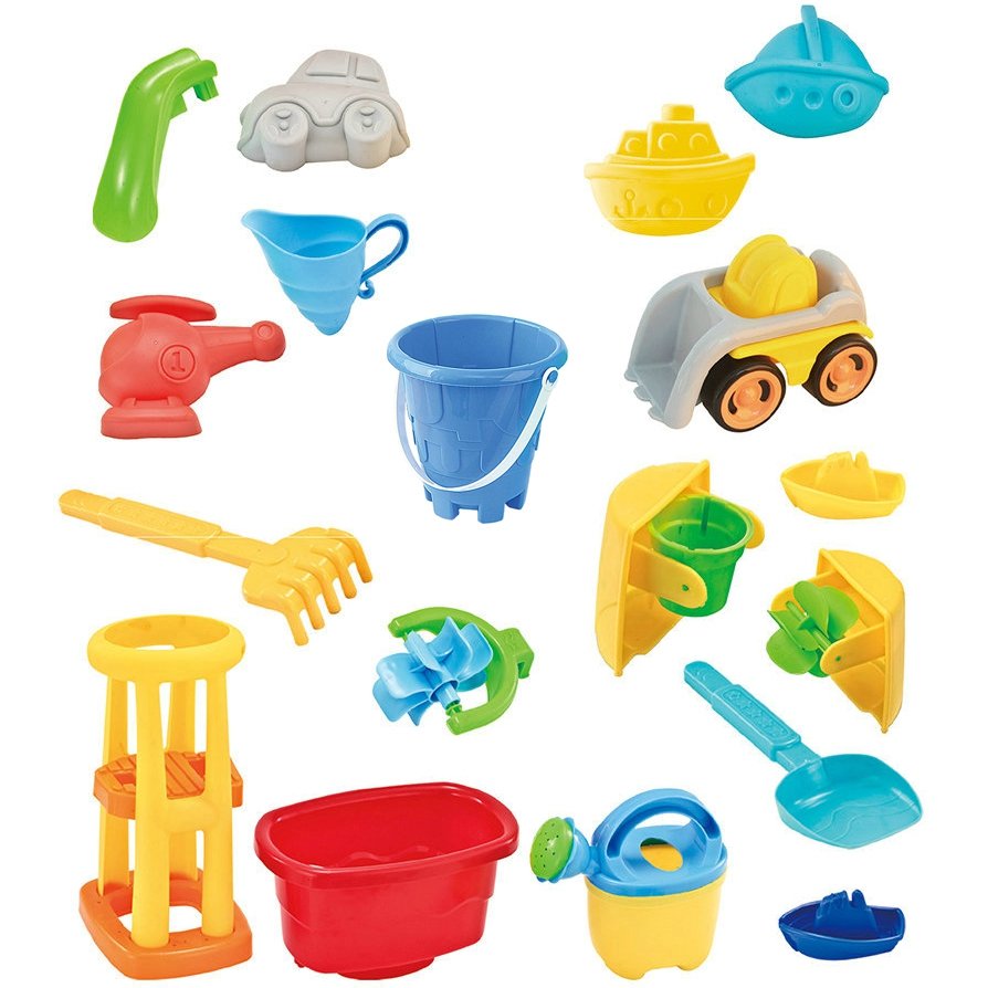 4 formos, laistytuvas, malūnas, kastuvas ir grėblys, žaislinis automobilis, 2 laivai